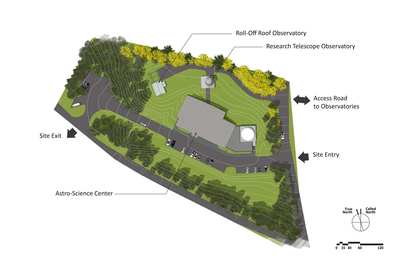 The site orientation and topography are design drivers, critical to obtaining clear views of the sky. Roof slopes, viewing angles, and the massing of both the Research Telescope and Astro-Science Center buildings are considered to optimize celestial observation activities while conforming to planning constraints of the Adirondack Park Agency.