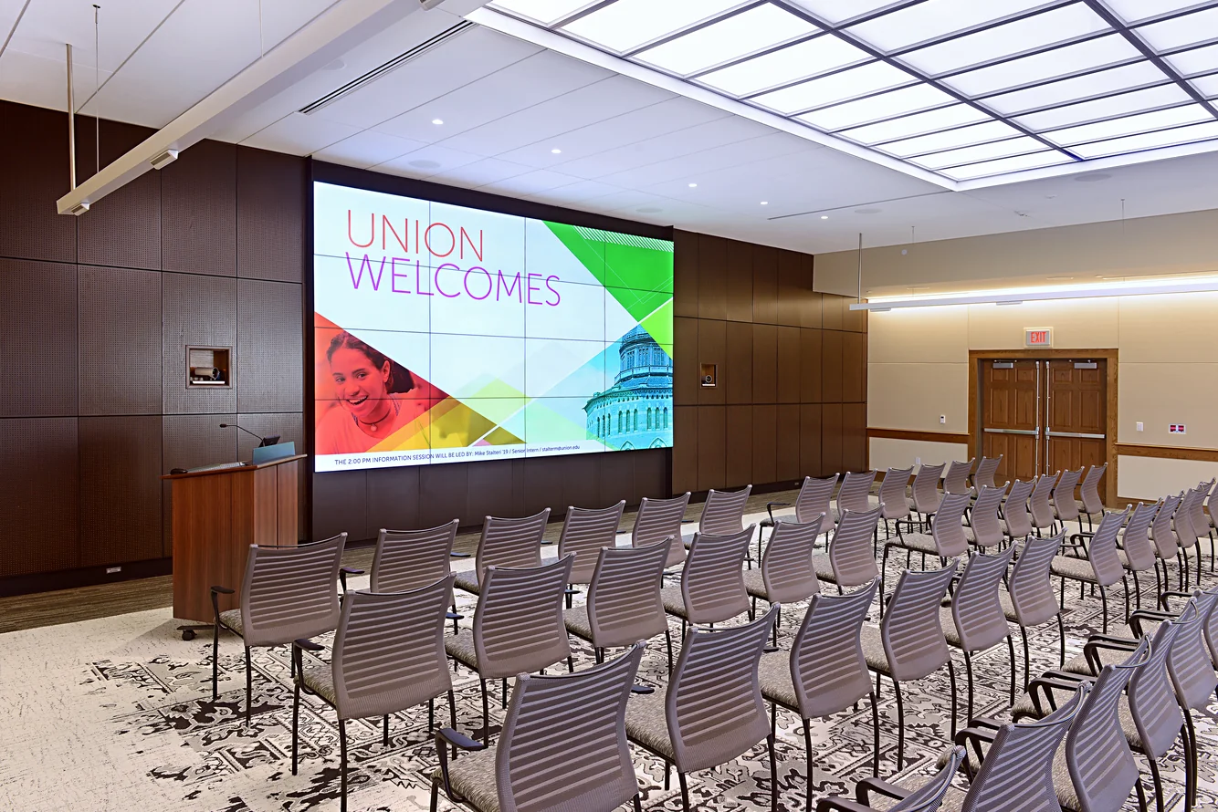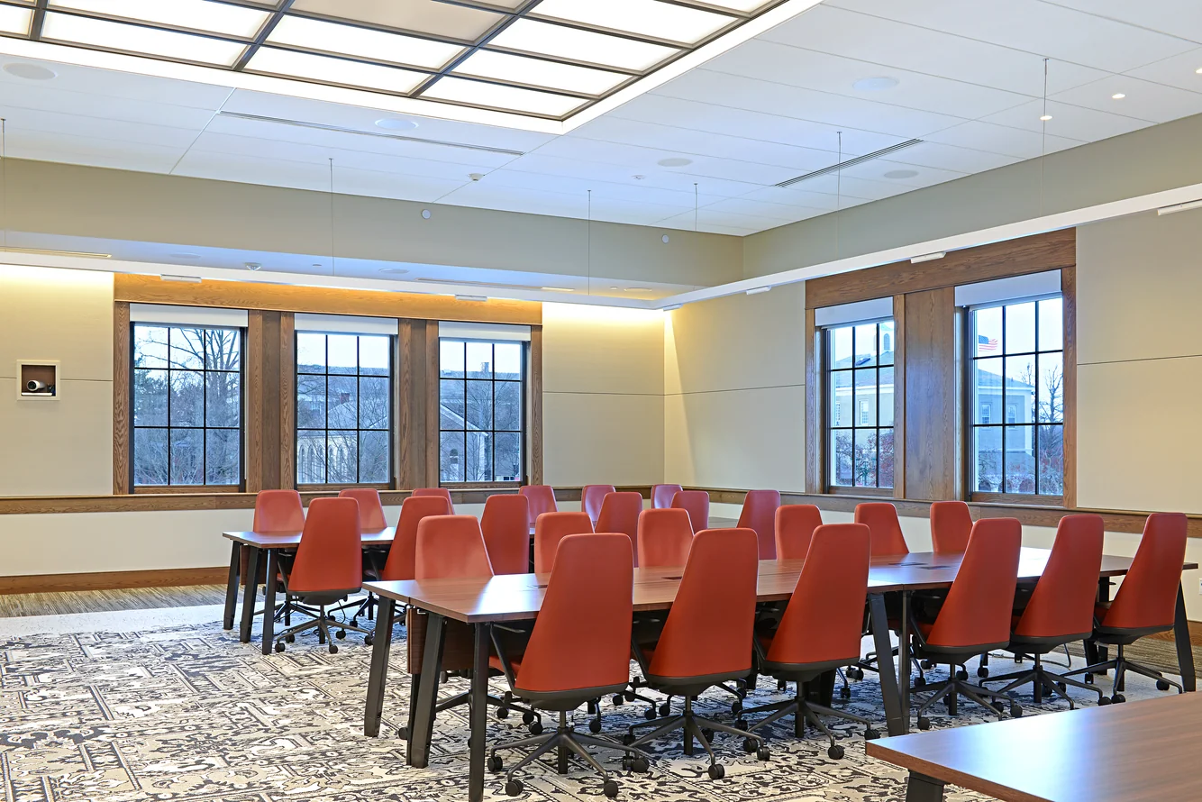 The heart of the project, the Presentation Room, is furnished with flexible furniture to accommodate multiple meeting configurations including U-shaped, conference ring, dining event, and lecture style seating. Comfortable modern stacking chairs are arranged in rows for use by Admissions tours. Providing a modern twist, carpet tiles and planks mimic traditional hardwood floors, while tapestry-looking carpet tile insets acknowledge the Grant Hall spaces, and add an ornate flair.