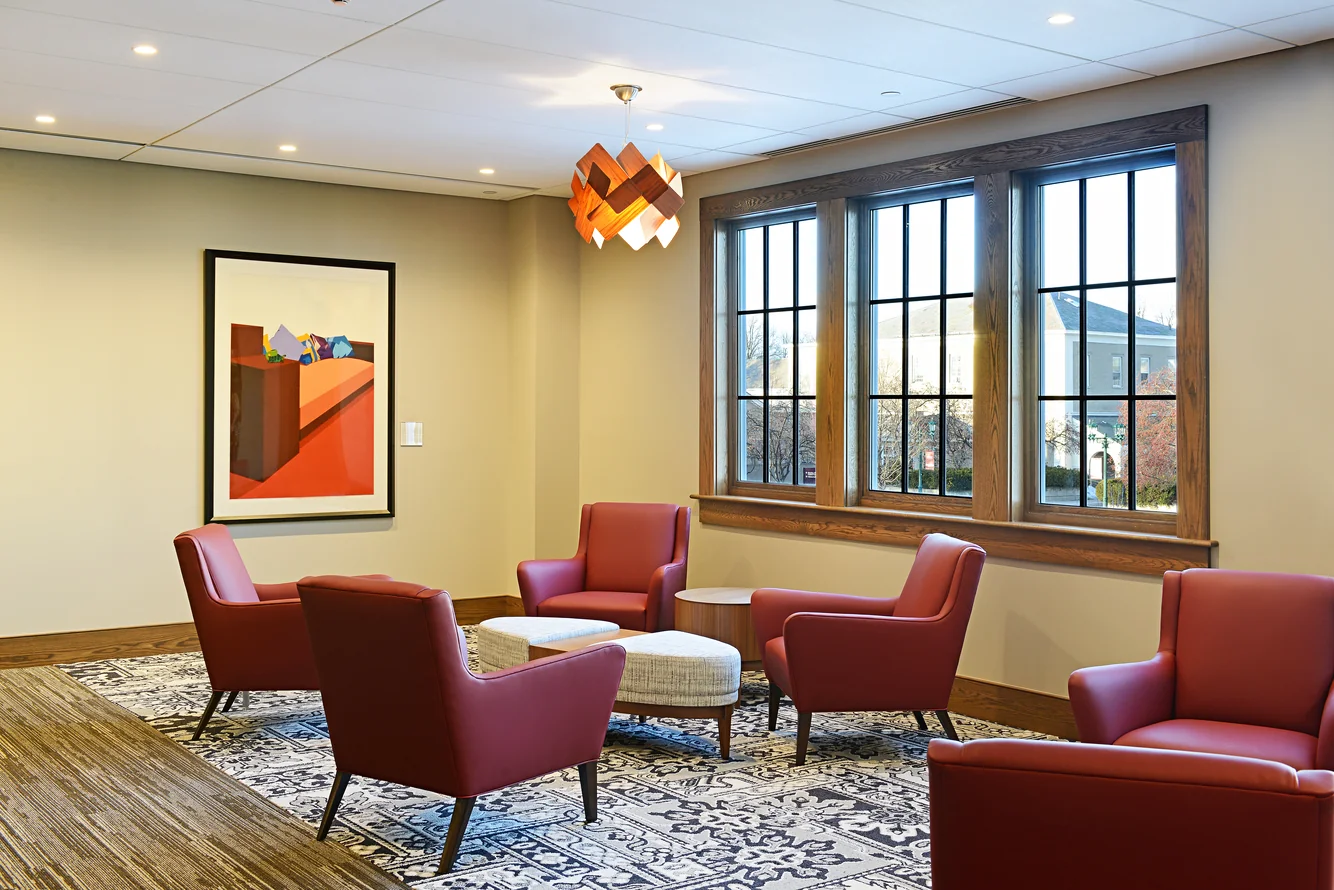 Visitors first experience a beautiful lobby inspired by refined boutique hotels. Modern, whimsical wing back chairs pop garnet red, enhancing the space with bursts of color, and the large windows create the feeling of a sun room with a stunning view. Carefully selected contemporary pieces of art, from Union’s significant collection, line the walls while warm, artistic lighting fixtures float above.
