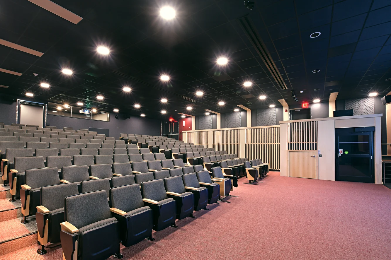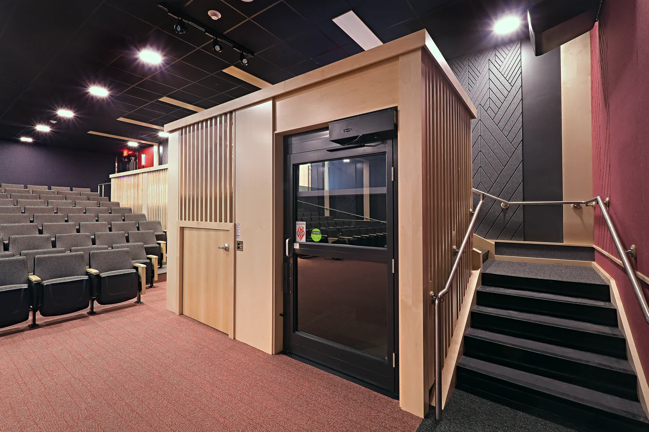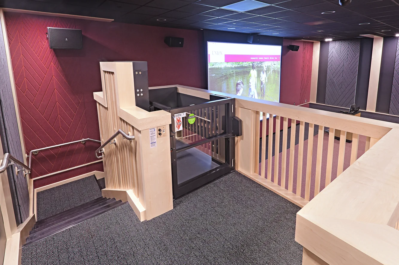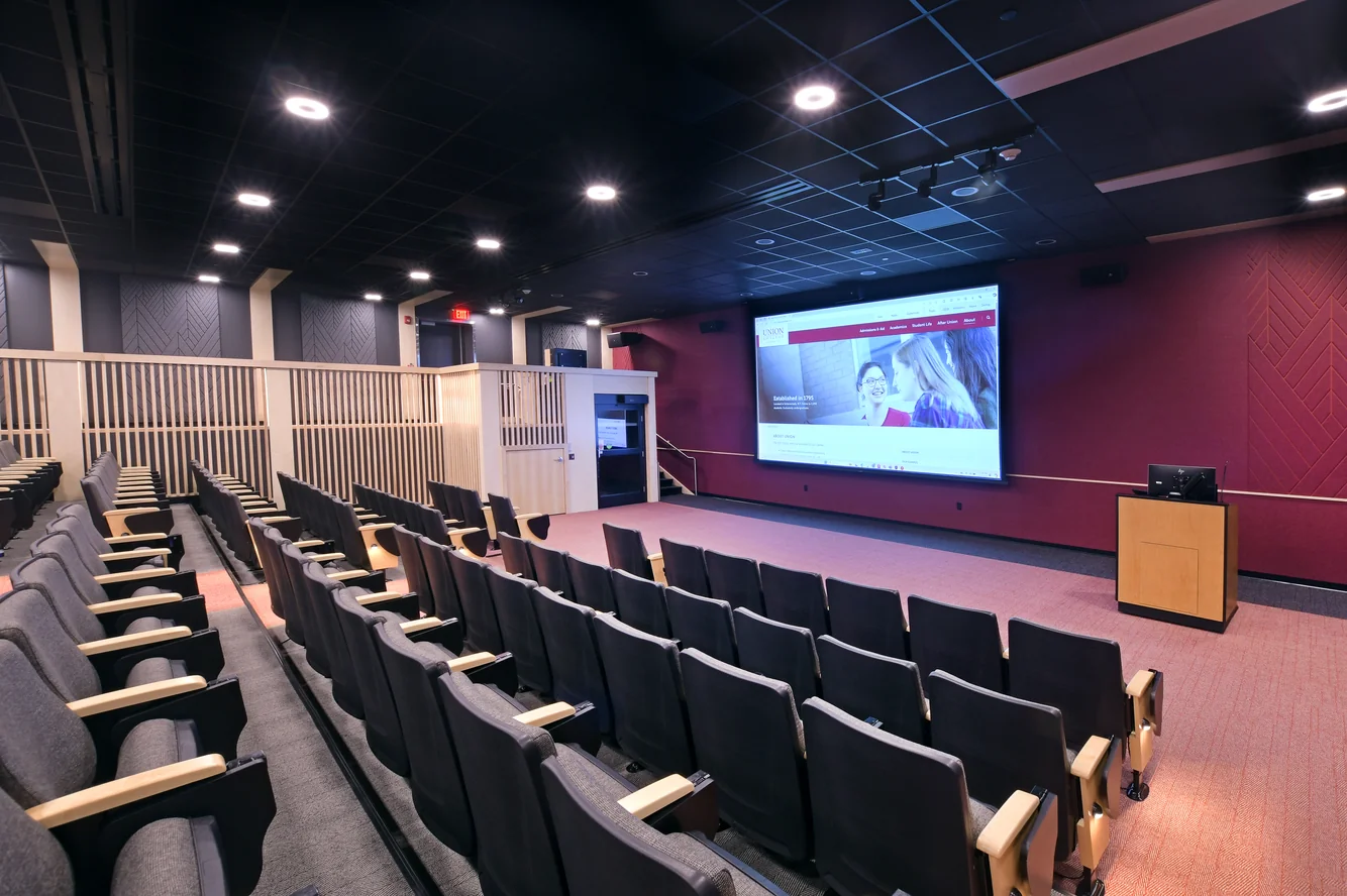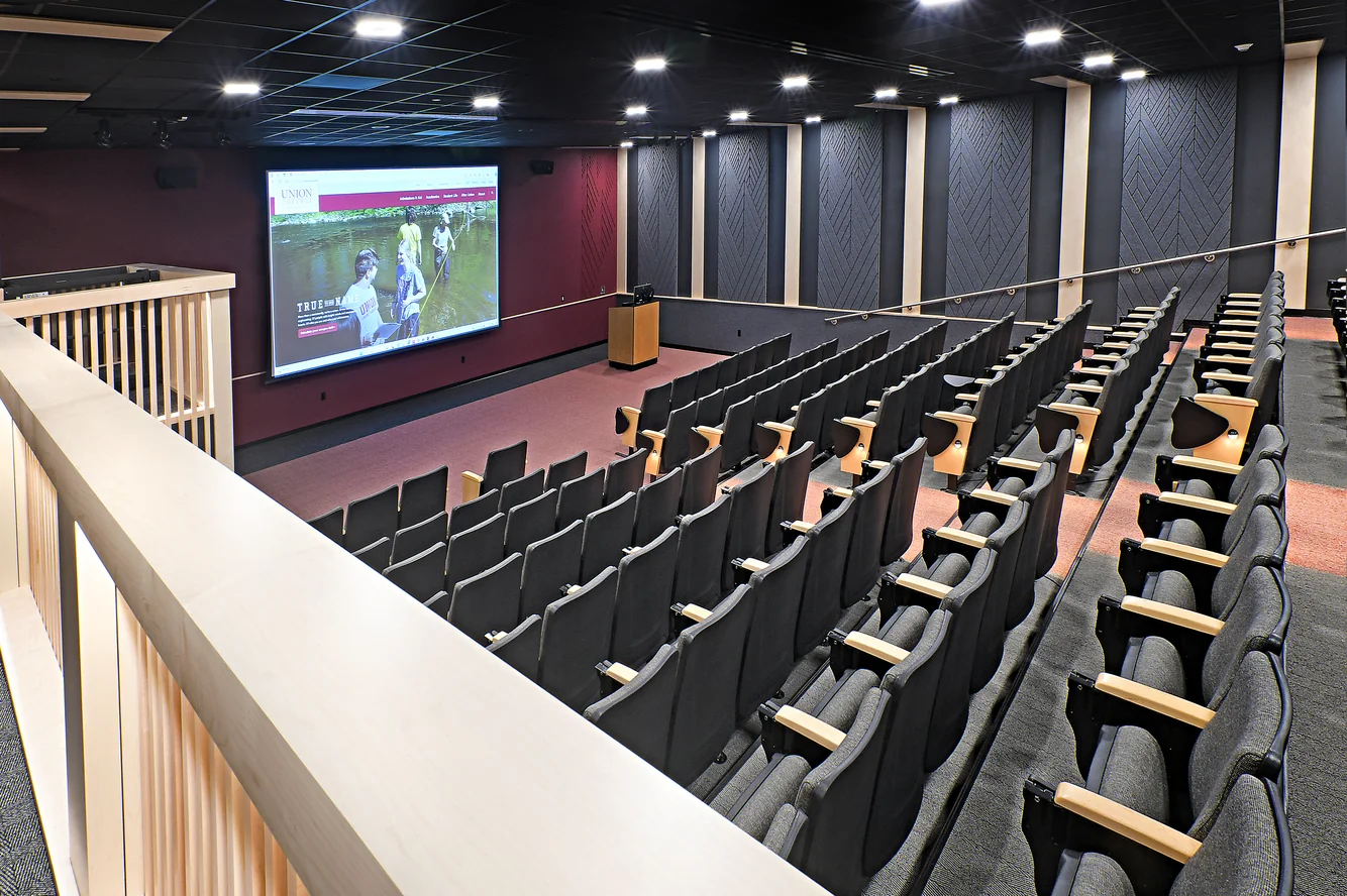 After a significant sprinkler main break flooded the main auditorium at Union, Envision collaborated with several campus constituents to design a complete renovation of the space. A multi-use space, the auditorium serves as an academic classroom, a large group meeting space, a movie theater and a social gathering hub for students, faculty and staff. Careful attention was paid to acoustic design to resolve sound issues which had previous existed in the auditorium. Accessibility was elevated as a priority, with the addition of a small lift inside to allow for universal access to the space.