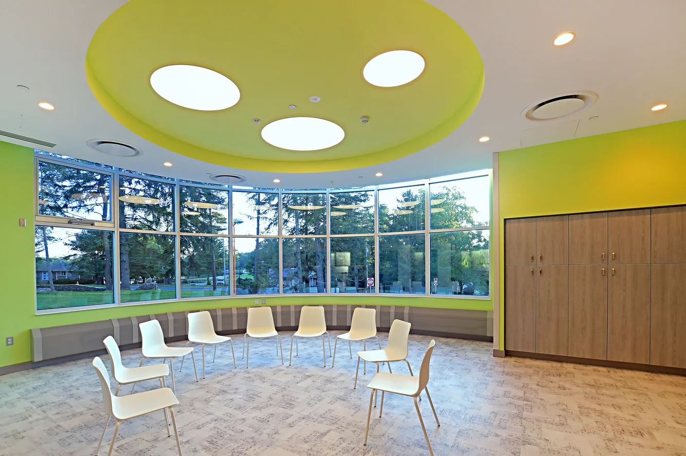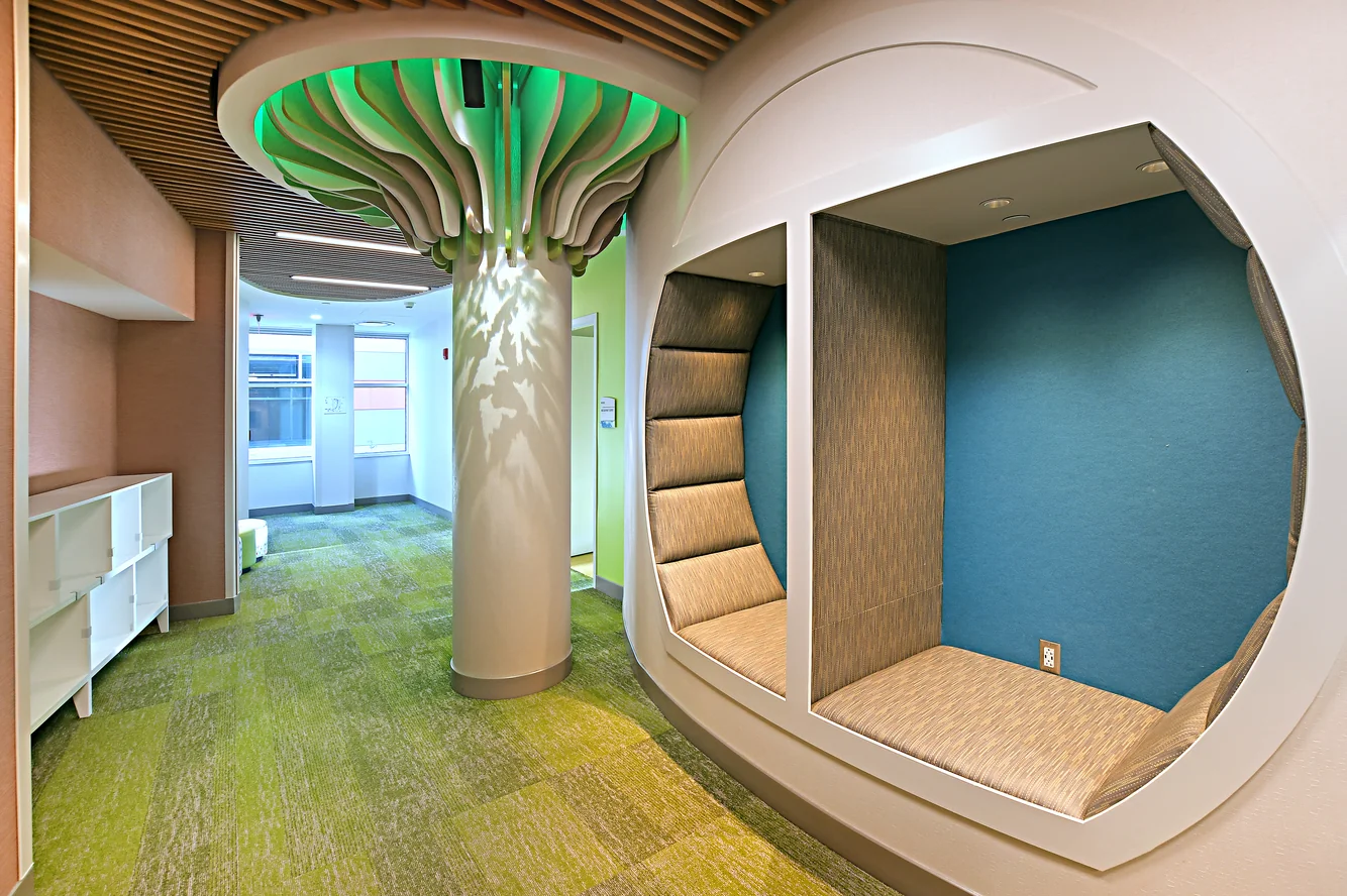 The Center for Discovery's Children's Specialty Hospital is a transformative adaptive reuse project that includes an addition to a former office building to house the Medically Fragile unit of the Skilled Nursing Facility. The nature of the places within and around the buildings were designed to provide a comprehensive flow of operations, while celebrating an energized aesthetic and memorable spaces.